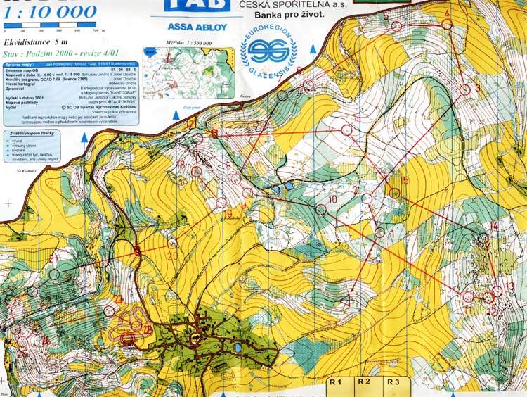 Bohužel selhala i technická příprava závodu. Nejedna kategorie měla na popisech a v mapě různý počet kontrol, což regulérnosti závodu moc nepomohlo, a tak mnoho kategorií (11) bylo zrušeno.Osobně se mi závody nelíbily, skutečně trať pro H21C obtížnosti H14D není nic pro mě. Cholerovi ale podobně jednoduché závody sedí, protože opět zazářil na předních místech výsledkové listiny.